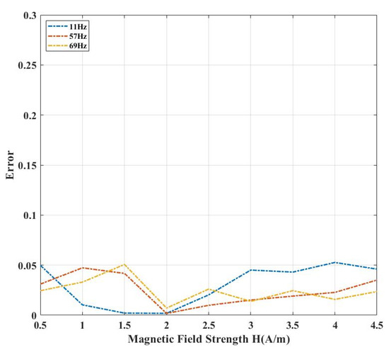Figure 6. Specifically, for each frequency, hysteresis loops with magnetic field strengths from 0.5 A/m to 4.5 A/m were measured multiple times, and the maximum deviations from repeated measurements were analyzed, as shown in