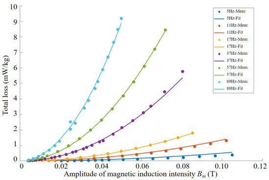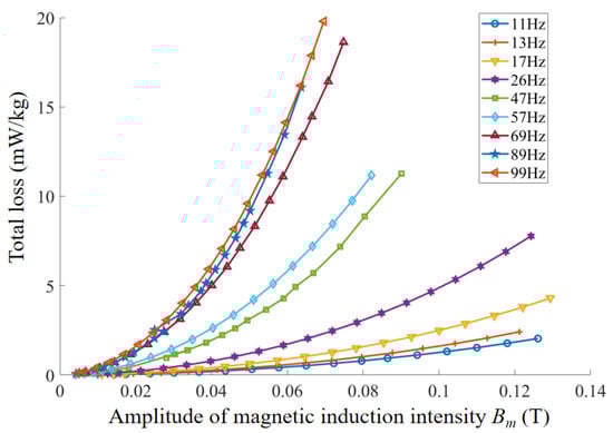 From the measurement results, the power losses under different frequencies and magnetic field strengths were calculated. By applying the Bertotti loss separation method, the hysteresis loss coefficient (
