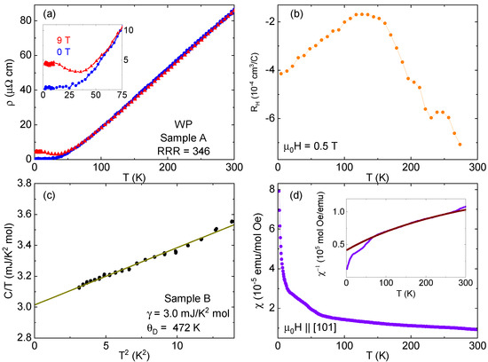 - Niu, Q.; Yu, W.C.; Aulestia, E.I.P.; Hu, Y.J.; Lai, K.T.; Kotegawa, H.; Matsuoka, E.; Sugawara, H.; Tou, H.; Sun, D.; et al. Nonsaturating large magnetoresistance in the high carrier density nonsymmorphic metal CrP. Phys. Rev. B 2019, 99, 125126. [Google Scholar] [CrossRef]