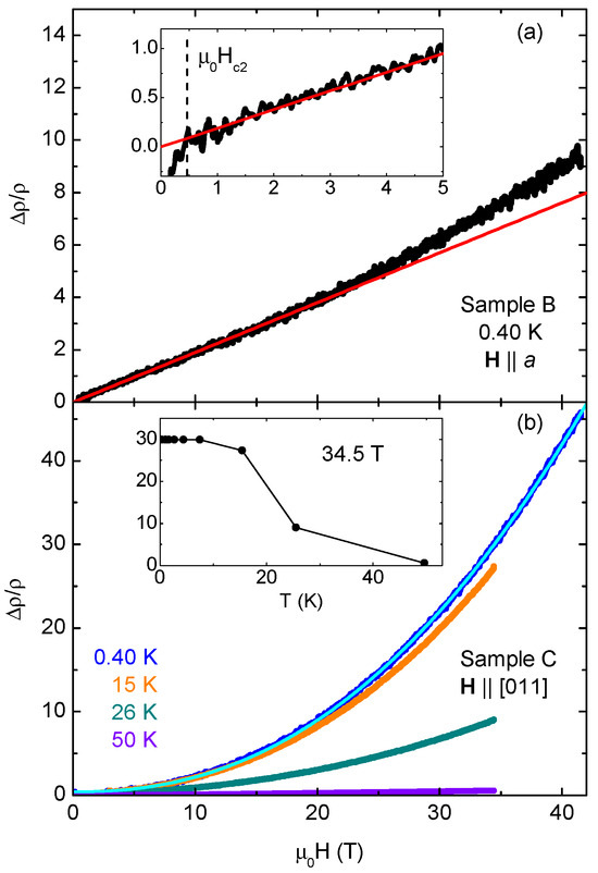 - Fallah Tafti, F.; Gibson, Q.; Kushwaha, S.; Krizan, J.W.; Haldolaarachchige, N.; Cava, R.J. Temperature-field phase diagram of extreme magnetoresistance. Proc. Natl. Acad. Sci. USA 2016, 113, E3475–E3481. [Google Scholar] [CrossRef] [PubMed]