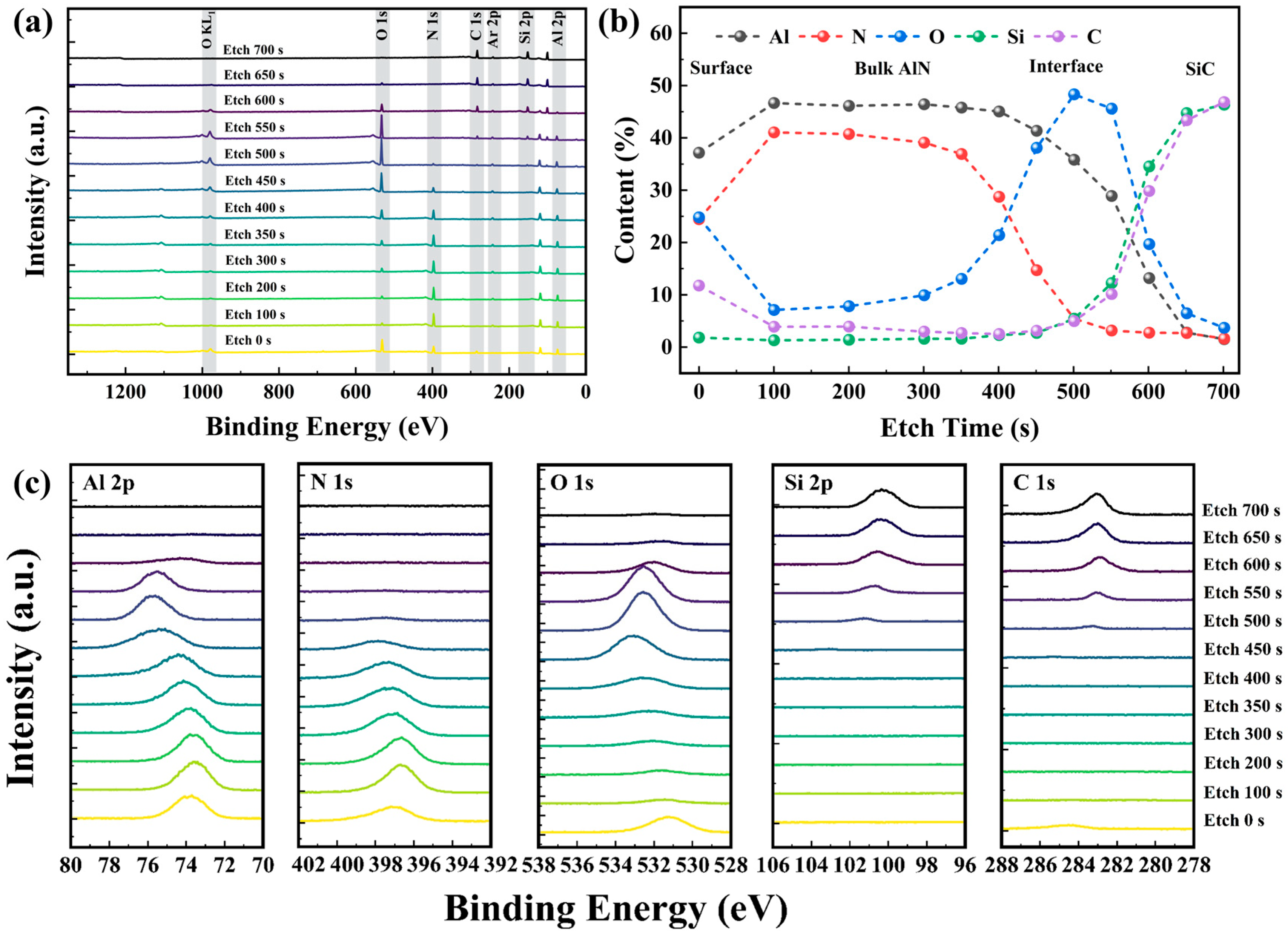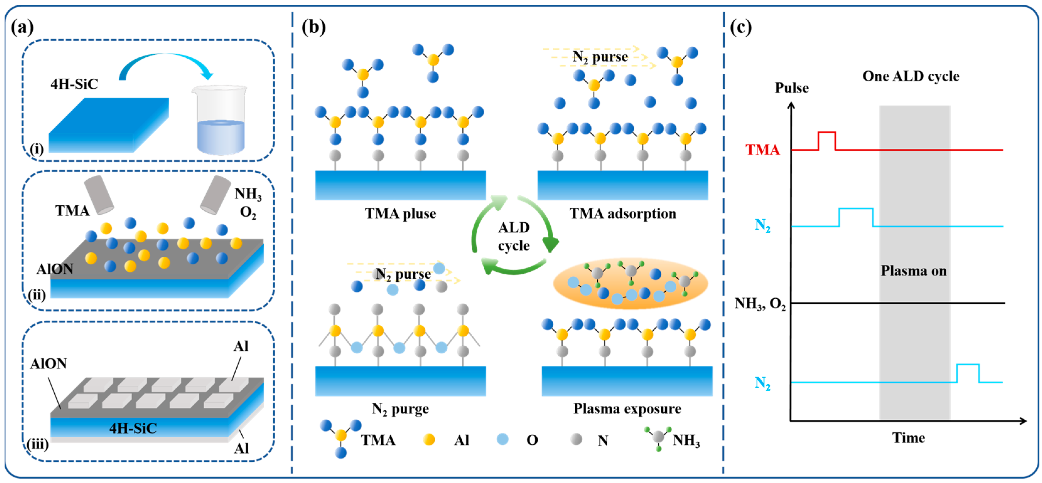 - Chen, J.; Lv, B.; Zhang, F.; Wang, Y.; Liu, X.; Yan, G.; Shen, Z.; Wen, Z.; Wang, L.; Zhao, W.; et al. The composition and interfacial properties of annealed AlN films deposited on 4H-SiC by atomic layer deposition. Mater. Sci. Semicond. Process. 2019, 94, 107–115. [Google Scholar] [CrossRef]