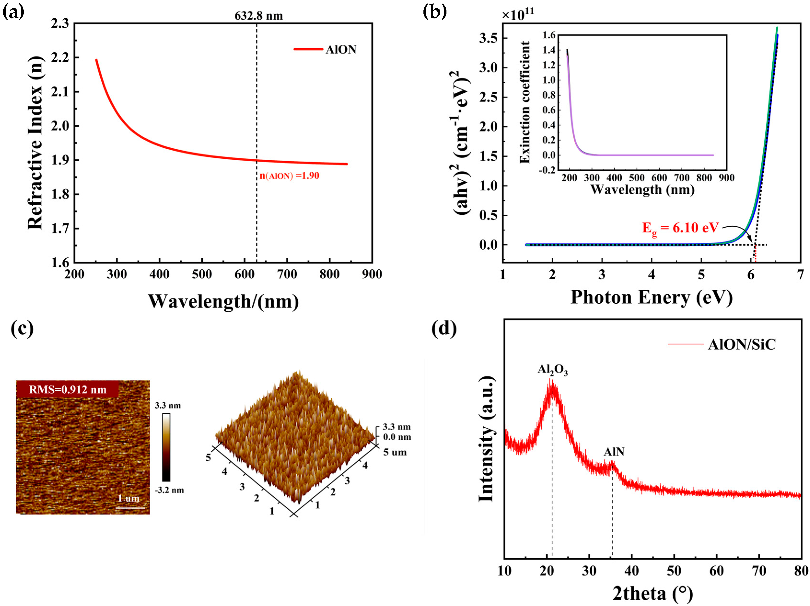 - Giba, A.E.; Pigeat, P.; Bruyère, S.; Easwarakhanthan, T.; Mücklich, F.; Horwat, D. Controlling refractive index in AlN films by texture and crystallinity manipulation. Thin Solid Film. 2017, 636, 537–545. [Google Scholar] [CrossRef]