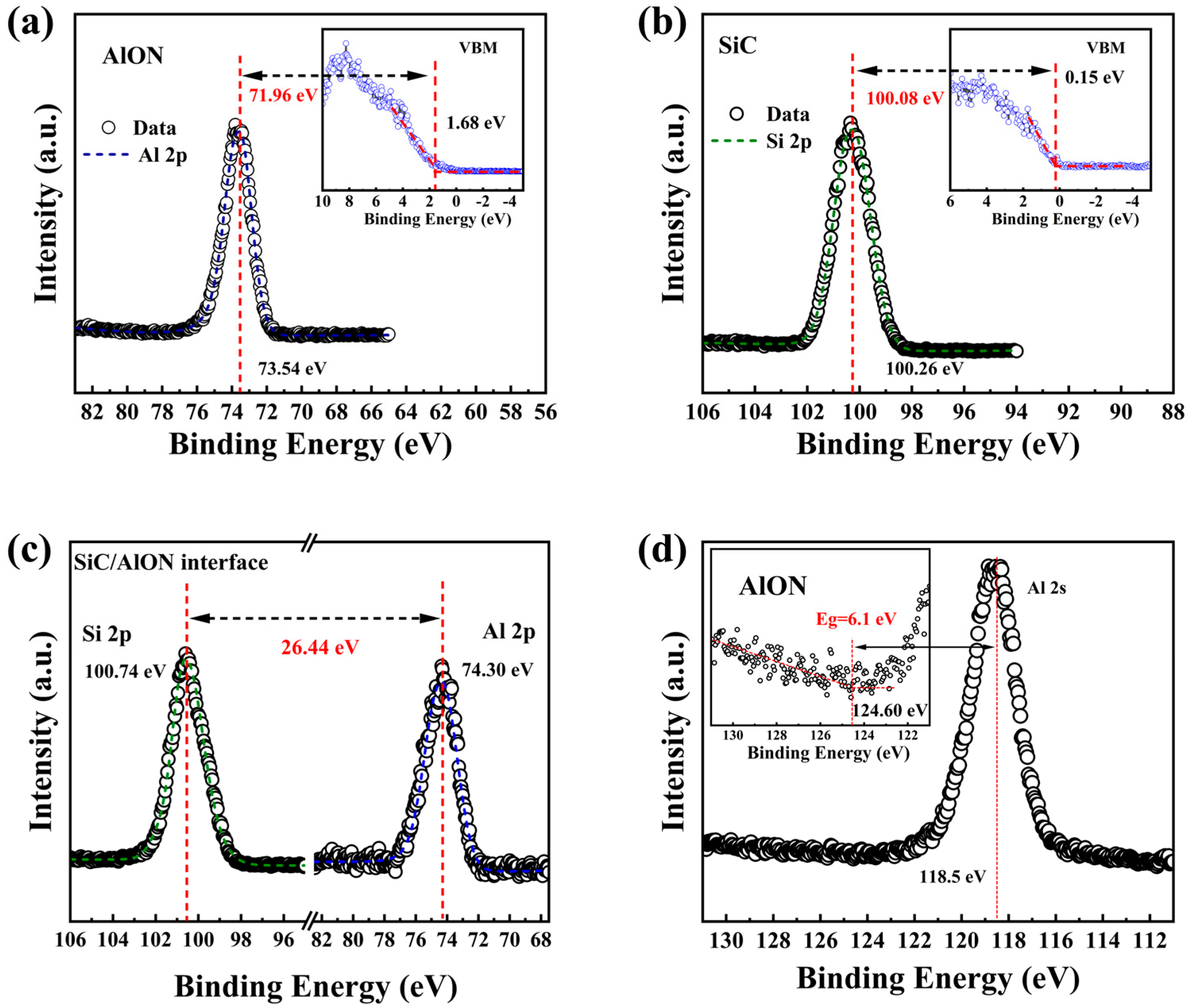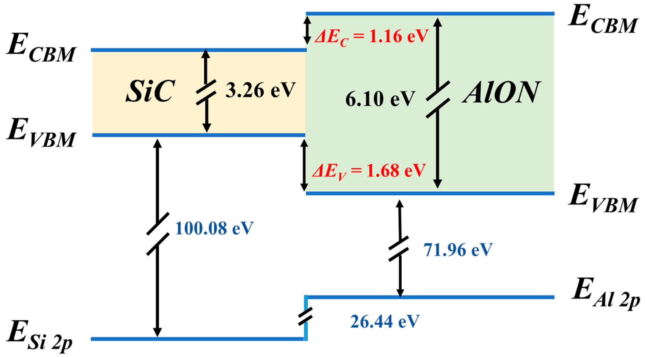 - Shen, Z.; Zhang, F.; Chen, J.; Fu, Z.; Liu, X.; Yan, G.; Lv, B.; Wang, Y.; Wang, L.; Zhao, W.; et al. Effects of annealing on the interfacial properties and energy-band alignment of AlN dielectric on 4H–SiC. Appl. Phys. Lett. 2020, 117, 102105. [Google Scholar] [CrossRef]