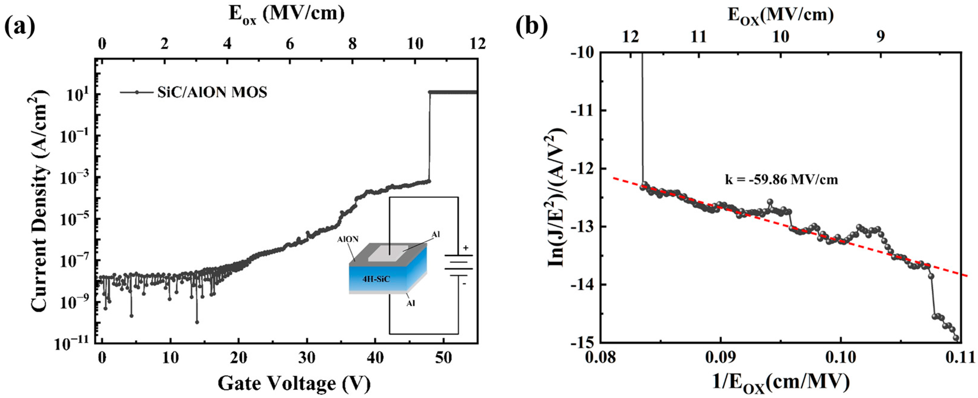 - Xia, J.; Wang, S.; Tian, L.; Zhang, W.; Xu, H.; Wan, J.; Wan, C.; Pan, Y.; Yang, F. Al(ON) gate dielectrics for 4H-SiC MOS devices. J. Cryst. Growth 2020, 532, 125434. [Google Scholar] [CrossRef]