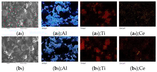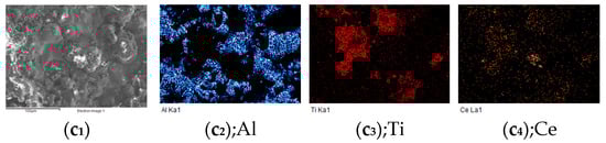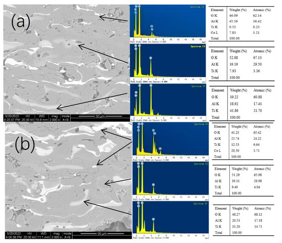 In comparison to the distribution of Ce in the coatings with different CeO2 concentrations, when 1% CeO2 was added to the coatings, the distribution of Ce was significantly diffused. The Ce was more concentrated on the surface pores or crevices of the coating and the interface where the Al-Ti components interacted when the CeO2 content reached 5%. When the concentration is increased to 8%, Ce became enriched in the gaps and coexisted more with Ti, as shown in Figure 2.