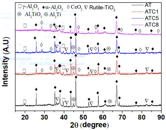 Figure 3 shows XRD patterns of the pure AT3 and doped with 1%, 5%, and 8% CeO2 coatings produced by plasma spraying. The spectra reveal that rutile-TiO2 and α-Al2O3 made up the majority of the AT3 coating, with tiny amounts of γ-Al2O3, Al2Ti, and Al2TiO5. When 1% CeO2 was added to the AT3 coating, the diffraction peak of CeO2 appeared in the spectra, which presented main diffraction peaks for CeO2 at 28.55° and 47.485°. Moreover, the diffraction peak of Al2TiO5 decreased, and the intensity of the diffraction peak for Al2TiO5 became less intense.