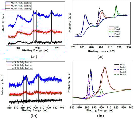 In Figure 4(a1), the spectra of Ce3d show four characteristic peaks, which are present at 883 eV, 898 eV, 901 eV, and 916 eV. Peak 916.3 eV is due to Ce (IV). The position of the characteristic peak Ce in the 1% CeO2 coating is clearly shifted, which should be related to Ce distribution and content. The intensity of each Ce peak increases clearly as the Ce concentration increases.