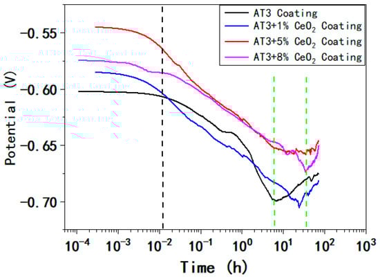 The duration of the intermediate phase differs between coatings. After about 7 h of immersion, the potential of the AT3 coating dropped sharply to about −0.699 V. The potential began to move forward gradually with time, and there was a clear inflection point in the overall curve. The inflection point of the Eocp vs. time curve for the coating doped with CeO2 was then obviously extended. At around 23.8 h, the obvious inflection point of the Eocp vs. time curve for AT3 + 1%CeO2 coating appeared. At this point, the lowest value of Eocp was −0.7052 V, and the open circuit potential (OCP) gradually began to rise. At around 33 h, the Eocp curve of the AT3 + 5%CeO2 coating exhibited a distinct inflection point, and the OCP showed a relatively gentle transition.