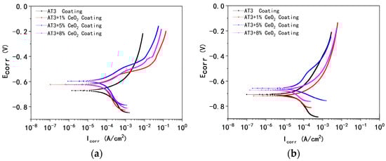 Figure 6. Potentiodynamic curve of AT3, AT3 + 1%CeO2, AT3 + 5%CeO2, and AT3 + 8%CeO2 coatings immersed in 5% NaCl solution ((a): immersed for 0.5 h; (b): immersed for 36 h) (optimum data from 5 repeated experiments).