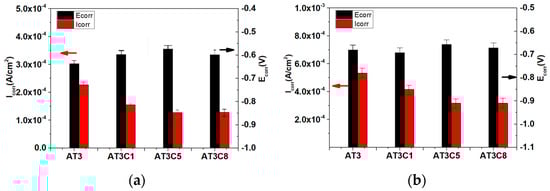 Figure 7. Corrosion potential and Tafel fitting results (mean ± SD, n = 5) for AT3, AT3 + 1%CeO2, AT3 + 5%CeO2 and AT3 + 8%CeO2 coatings immersed in 5% NaCl solution ((a): immersed for 0.5 h; (b): immersed for 36 h) (optimum data from 5 repeated experiments).