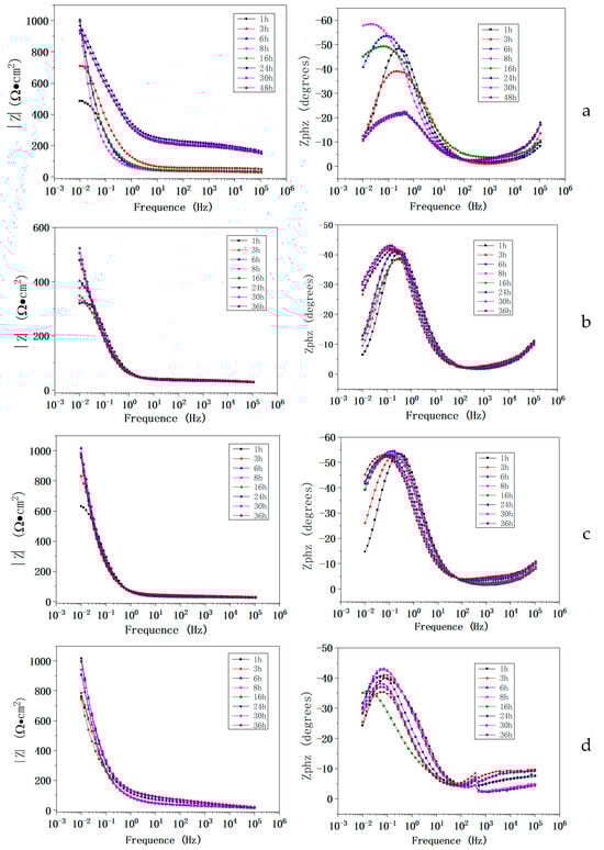 Figure 8. EIS curve of AT3, AT3 + 1%CeO2, AT3 + 5%CeO2, and AT3 + 8%CeO2 coatings immersed in 5% NaCl solution ((a): AT3 coating; (b): AT3 + 1%CeO2 coating; (c): AT3 + 5%CeO2 coating; (d): AT3 + 8%CeO2 coating) (optimum data from 5 repeated experiments).
