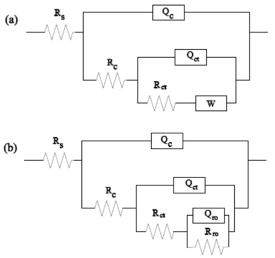Figure 9. Equivalent electrical circuit for EIS result ((a): AT3 coating; (b): AT3 + 1%CeO2 coating, AT3 + 5%CeO2 coating, and AT3 + 8%CeO2 coating).