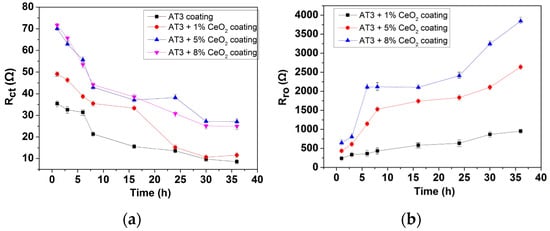Figure 10a shows the curve of Rct of four different coatings with immersion time. Rct denotes the coating diffusion resistance in the equivalent electrical circuit, and the corrosion rate is generally inverse. According to the fitting results, the Rct of AT3 coating was relatively higher than that of the others. The diffusion resistance of AT3-CeO2 coating significantly reduced with CeO2 doping, which is related to the reduction in coating porosity and defects and contributed to the current flow during the corrosion process [29].