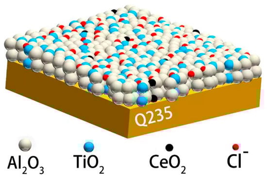 Most of the benefits of the Al2O3-TiO2 coating still remain after it has been created via plasma spraying; nevertheless, the coating’s porosity and flaws affect how well it resists corrosion [3,12]. Therefore, many techniques were applied, including heat treatment, sealing, doping rare-earth elements, doping nanoparticles, and nanoscale powders, to reduce the porosity and flaws of the coating [3,13,14,15]. Among these techniques, doping with rare-earth oxides into the coating has proven to be an effective method for reducing its porosity and flaws. Rare-earth oxides typically occupy the inter-splat boundaries and pores of the coating, thereby enhancing its corrosion resistance [16,17]. In our earlier research [18], it was found that the rare-earth oxide CeO2 decreased the coating’s porosity and enhanced protectiveness of the Al2O3-TiO2 coating. The coating doped with 5 wt% CeO2 showed a more compact structure, which prevented chloride ion penetration, and improved its protectiveness. However, the question remains whether further increasing the content of rare-earth oxides in the coating can enhance its qualities, particularly in terms of long-term corrosion resistance. There are now several studies on coating with Al2O3-TiO2 or doping with rare-earth oxide, and many studies on its corrosion behavior [16,19,20], but research on the long-term corrosion behavior of such coatings remains limited. In long-term immersion for the coating prepared by plasma spraying, defects such as pores and cracks become an effective channel for corrosive ions to penetrate the coating, causing a fatal impact on the oxide coating. This process obviously reduces the isolation and shielding effect of the coating, directly causing corrosion to the protected matrix. As an effective method to improve the porosity of the coating, the role of rare-earth elements in the long-term immersion process remains to be further studied.