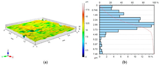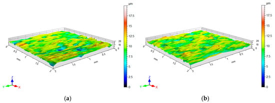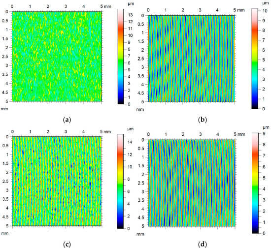 The topography of the sheet metal in its as-received condition (Figure 1), and after friction testing was examined using a Hommel-Etamic T8000RC profilometer (Jenoptik, Jena, Germany), in accordance with the standard [45]. The basic surface roughness parameters of the DC01 steel sheet in as-received condition are listed in Table 1.