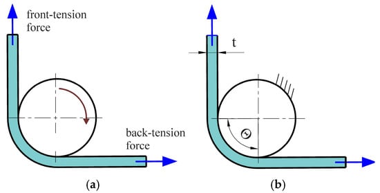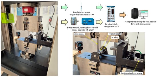 The device consisted of a housing containing a bearing-mounted shaft with a cylindrical countersample (radius of 15 mm), which corresponds to the range of radii of punch edges used when forming sheet metals [46]. A freely rotating countersample allowed for separate bending effects in the BUT test [24,25]. A horizontally positioned holder equipped with a type 9345B Kistler piezoelectric force sensor (Kistler, Winterthur, Switzerland) was used to secure one end of a 400 mm long and 18 mm wide strip sample. The other end of the strip sample was mounted in the upper grip of a Zwick Z100 testing machine (Zwick/Roell, Ulm, Germany). The device housing was mounted in the lower grip of the testing machine (Figure 3).