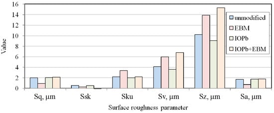 Cylindrical countersamples were prepared with different working surfaces. The base (unmodified) countersample was made of 145Cr6 tool steel (hardness 250HV). The countersamples’ surfaces were modified by the ion implantation (IO) of Pb (IOPb), electron beam melting (EBM), and combined ion implantation of Pb and EBM (IOb+EBM). The preparation procedure of countersamples, IO, and EBM process parameters were presented in a previous study [6]. The lowest average roughness was characteristic for countersamples after the EBM process (Figure 5). The remaining countersamples were characterised by more than twice the average roughness (Sa = 1.7–1.81 μm). Figure 6 presents the topography of the countersample.