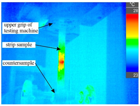 The Prescale film is designed to measure pressures within a temperature range between 20 and 35 °C. Strain-induced internal friction of the sample did not cause significant heating of the sample surface. The sample surface temperature in contact with the countersample was approximately 24.5 °C (Figure 7). A Testo model 883 thermal imaging camera (Testo Sp. z o.o., Pruszków, Poland) was used to measure the temperature of the sample surface.