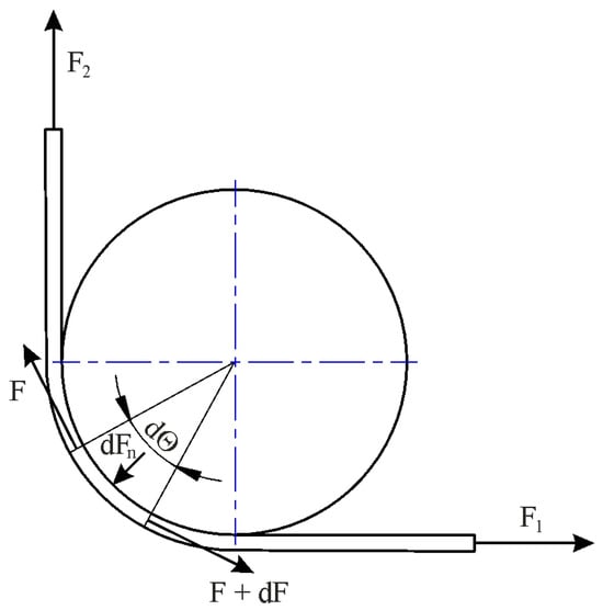 Fox et al. [49] proposed a modification of Equation (4). Determining the friction coefficient value in the BUT test involves measuring force parameters in two variants: with a fixed countersample and with a free countersample. The difference in the tensile forces in both test variants allows for separating the friction force from the total stretching force of the sample and, on this basis, calculating the CoF value. Figure 9 illustrates the forces acting on a specimen during the friction test. Fl is the applied forward tension, Fb is the front-tension force due to bending/unbending, and F2 is the resulting back-tension force.
