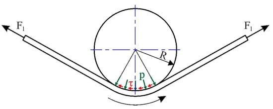 Saha and Wilson [25] proposed the modification of Equation (14) by taking into account the bending and unbending effects of the strip on the front-tension force F1. After subtracting Fb from the F1 force, the expression for the CoF under wrap angle Θ = 90° becomes