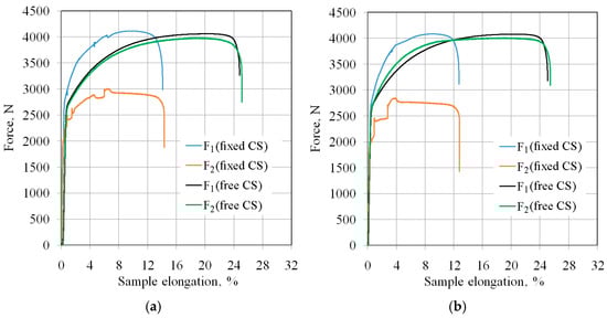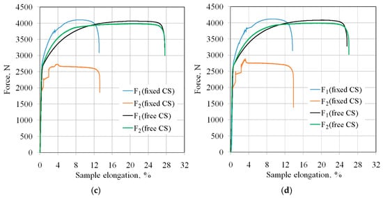 Figure 11 shows the change in force parameters during two stages of the BUT test with the freely rotating countersample (CS) and stationary countersample. Under the freely rotating countersample condition, the total elongation of the sample was between 25.1% (EBM and unmodified countersamples) and 28% (IOPb+EBM). During the test with the stationary countersample, the elongation of the samples at breaking point was between 12.7% (Figure 11b) and 14.3% (Figure 11a). The largest friction-induced reduction in the sample elongation to breaking point was observed for the IOPb+EBM countersample, from 27.6% to 13.2% (Figure 11a). In contrast, the highest friction-induced reduction in the strip sample elongation was recorded for the IOPb+EBM countersample (Figure 11c), from approximately 27.5% to 13%. This indicates that the most unfavourable high-friction conditions occurred for the IOPb+EBM countersample. In the freely rotating countersample, the sample elongation was not affected by friction, and the curves were smooth with a continuous increase in force associated with the work-hardening phenomenon.