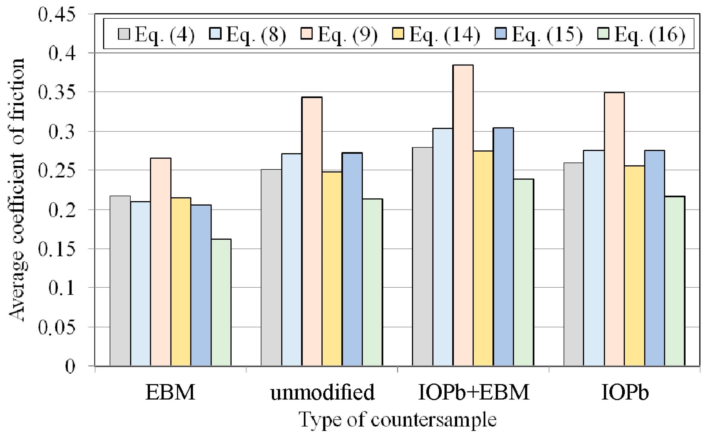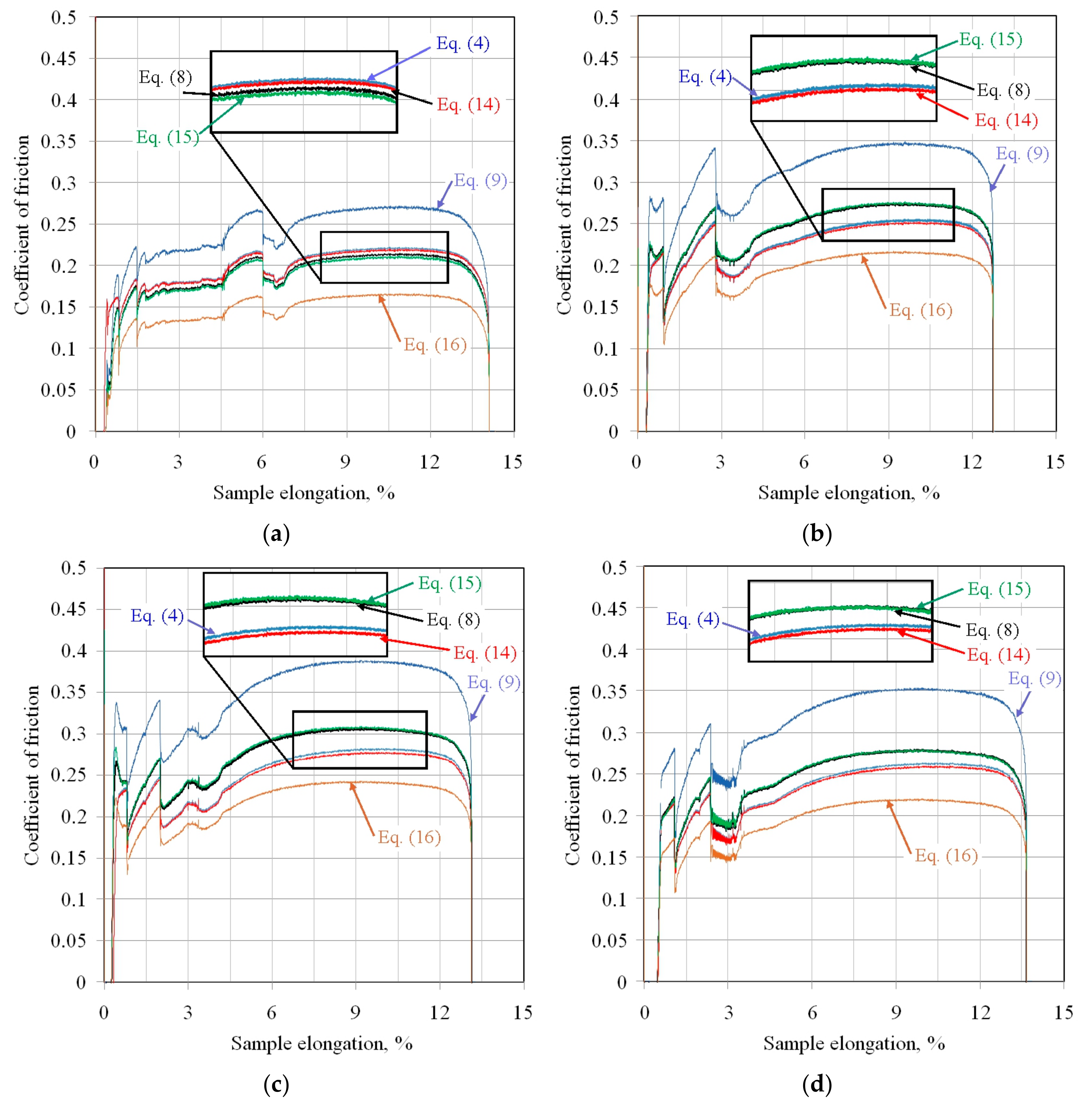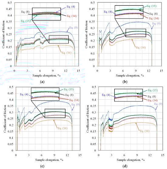 - For all friction conditions, the highest friction coefficient values were obtained for Equation (9). The lowest CoF value for all friction pairs was obtained for Equation (16).