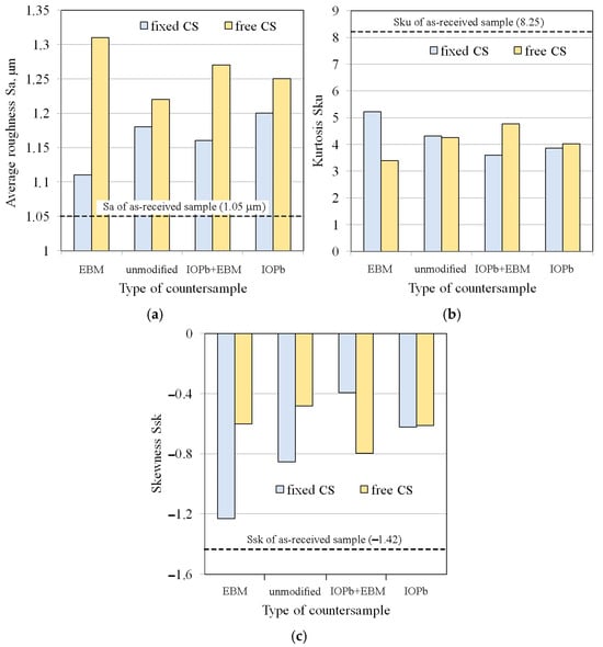 Effect of countersample condition on the surface roughness parameters of a strip sample: (a) average roughness Sa, (b) kurtosis Sku, and (c) skewness Ssk.
