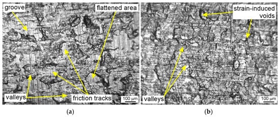 The surface roughness of the samples after friction testing was examined on the side of the samples in contact with the countersamples. The friction process under stretch-forming conditions increased the average surface roughness of the strip samples (Figure 14a). During friction with the freely rotating countersample, the average roughness was higher than for the stationary countersample. Rolling contact limited the adhesion phenomenon, which limited the friction-induced flattening of the asperity summits. Consequently, the average roughness for the above-mentioned samples was higher than for friction with stationary countersamples (Figure 14a). In the stationary countersample conditions, the flattening phenomenon (Figure 15a) was accompanied by the adhesion of the asperity summits and resulted in more intense mechanical contact compared to the rolling contact conditions with the freely rotating countersample. The sample surface obtained after friction with a freely rotating countersample showed no friction traces (Figure 15b). Under friction testing with a stationary countersample, the largest increase in average roughness (by 19%) was found for the DC01/IOPb friction pair. The rotating countersample condition increased the average roughness by 5.7% and 14.3% for the DC01/IOPb and DC01/EBM friction pairs, respectively.