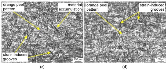 The outer surface of the samples was not the subject of quantitative studies in this article. However, it is obvious that the free surface of the sheet becomes rough with increasing plastic strain. This phenomenon causes the formation of orange peel patterns (Figure 15c,d), which are defects of the sheet surface. High surface roughness, including the orange peel effect, affects the quality of a paint coating finish in the automotive industry [64]. High surface roughness caused by the forming process is also one of the limitations of single-point incremental sheet forming [65,66].