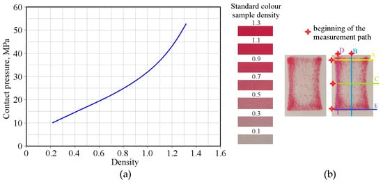 The Prescale pressure measuring film (FuJiFilm Corp., Tokyo, Japan) was used to determine the contact pressure values in the BUT test. Fujifilm’s Prescale film is an innovative product for measuring pressure distribution and its range. It turns red depending on the pressure applied, enabling a visual and quantitative analysis of contact pressure distribution. The Prescale film consists of two layers: a base layer with dye microcapsules (layer A) and a base layer with an activator (layer C). When pressure is applied to the film, the microcapsules in layer A rupture, releasing the dye, which reacts with the activator in layer C. The measurement accuracy of the Prescale film is sensitive to tangential slip, so contact pressure measurements were performed during a test with a freely rotating countersample. Based on image analysis, the relationship between sample colour and contact pressure [47] was determined.