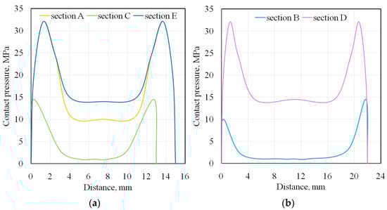 The difference between the highest and lowest average friction coefficient values, determined by the analytical models considered, was approximately 40%. Considering the types of counter-samples, two different relationships can be observed, indicating that the type of surface topography can influence the prediction of the CoF using a specific mathematical equation. In the case of the DC01/EBM friction pair (Figure 12a), Equations (4) and (14), as well as Equations (8) and (15), present almost identical friction coefficient curves. However, the remaining friction pairs, Equations (8) and (15), as well as Equations (4) and (14), represent similar friction coefficient curves. It is likely that the specific friction conditions of the DC01/EBM led to a disturbance in the ratio between front-tension and back-tension forces during the test. Equations (4), (8), (9), (14) and (15) were derived assuming uniform contact pressure between the strip sheet and the cylindrical countersample. Meanwhile, according to Figure 18b, there are two peaks before the outlet and after the inlet of the sheet, which was also previously observed in [27,42,67], among others. Given the simplified assumptions used to derive Equations (4), (8), (9), (14) and (15), the authors of Equation (16) proposed the replacement of the assumption of uniform pressure with two concentrated forces corresponding to the location of the two contact pressure peaks (Figure 18). Therefore, Equation (16), based on the current state of knowledge, is the most reliable and predicts the lowest CoF values among all the analysed conditions (Figure 12a–d).
