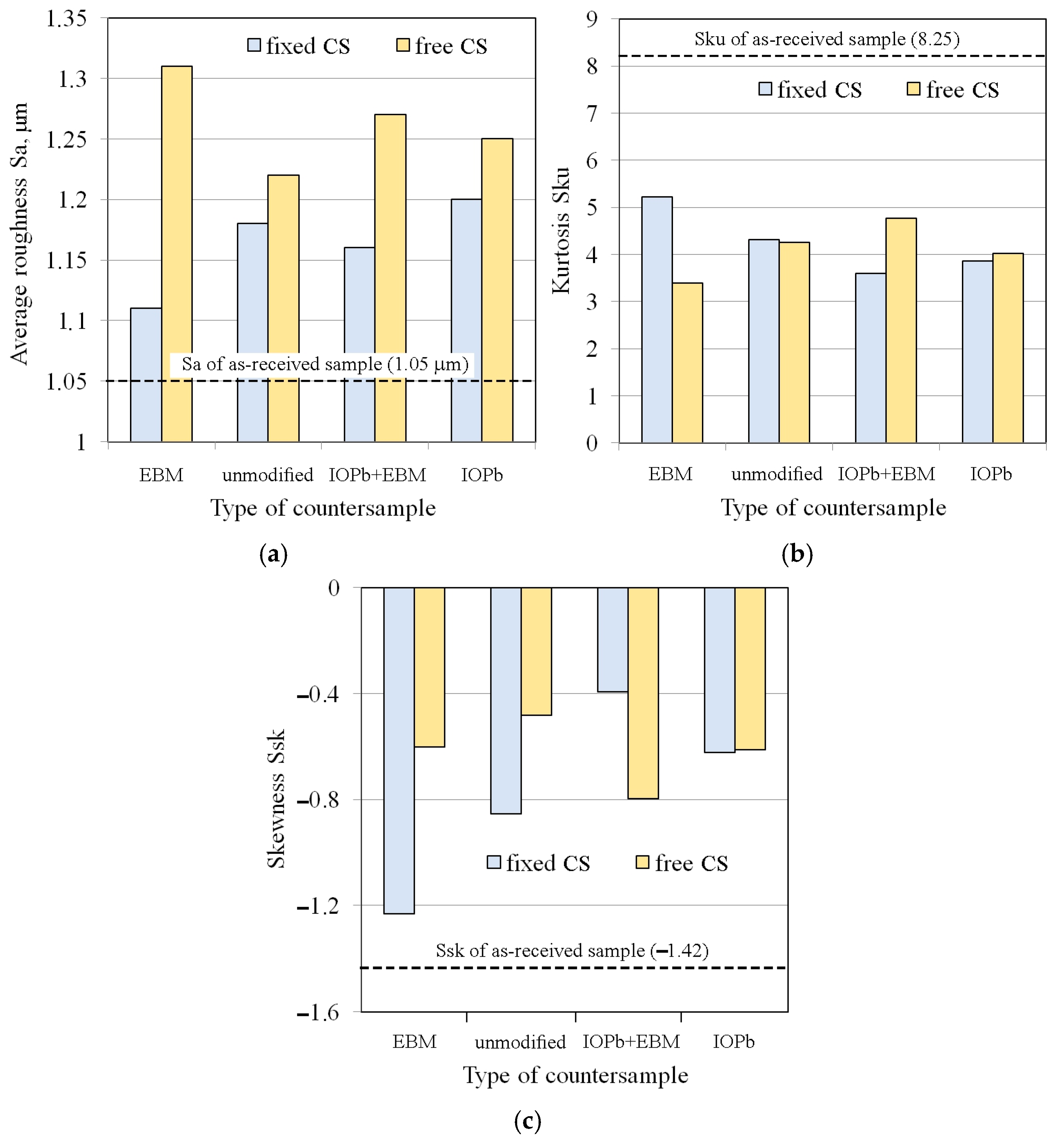 - Under friction testing with a stationary countersample, the largest increase in average roughness (by 19%) was found for the DC01/IOPb friction pair. The friction process caused a significant decrease in kurtosis values.