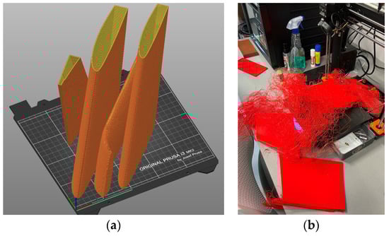 The recent drone prototyping project [27] motivated the development of the present study. That project developed an FFF model of the drone wing for manufacturing with a desktop 3D printer. The model had to maintain the drone’s weight, which was designed from expanded polyethylene. This constraint imposed strict weight limitations. The fabrication space limitations of the Prusa i3 MK3 3D printer (PRUSA RESEARCH, Prague, Czech Republic) necessitated fragmentation during the slicing stage of the FFF process. Figure 1 illustrates the slicing strategy applied to the drone prototype, while Figure 2 highlights the fabrication flaws encountered during the printing process. The weight limitations resulted in a reduction of the wall thickness in the wing fragments and the rejection of the support surfaces in the sliced model (Figure 2a). However, this geometric reduction (i.e., insufficient bonding area) resulted in inadequate adhesion to the printing bed, ultimately causing fabrication failure, as shown in Figure 2b. Increasing the bonding area addressed this issue [27]. Still, the debonding of the polymeric parts (e.g., Figure 2b) prompted the development of a warpage prediction model tailored to simulate differential layer deformation in 3D-printed polymeric components. This explicit consideration of the detachment phase distinguishes the present work from previous studies and provides a more realistic assessment of failure risks in FFF-produced components.