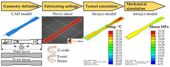 The mechanical performance of FFF components is susceptible to thermal gradients and cooling rates, which are influenced by process parameters such as nozzle temperature, printing speed, and layer thickness [6,7,8,9]. Finite element (FE) simulations serve as a powerful predictive tool for analyzing stress development and deformation patterns. However, experimental optimization remains resource-intensive, underscoring the need for robust models that can simulate the FFF process with high fidelity [10,11]. A key advancement in this domain is the implementation of element activation strategies within the FE modeling framework, enabling the progressive construction of the FFF part in a virtual environment [12]. This approach captures the sequential nature of material deposition and the evolving thermal and mechanical states of the structure [13]. Early studies by Zhang and Chou [14,15] demonstrated the effectiveness of this method in analyzing the formation of residual stress in acrylonitrile butadiene styrene (ABS) components. Cattenone et al. [16] emphasized the importance of accurate constitutive modeling for predicting distortions.
