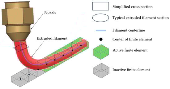 The element activation strategy employs a progressive element birth approach, wherein elements are activated when their centroids intersect the defined deposition path. This method, initially introduced by Zhang and Chou [14], has been widely adopted in FFF simulations due to its capability to replicate the sequential nature of material deposition. In this study, the filament’s elliptical cross-section was approximated as a rectangle, and a binary state variable was assigned to each element, indicating activation (1) or inactivity (0) at a specific time.
