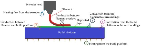 In the FFF process, the filament is extruded at a temperature of Tf and deposited onto a heated build platform maintained at a temperature of Tb. The classical heat conduction equation governs the transient thermal behavior of the printed part [34]: