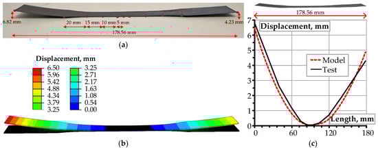 Experimental validation was performed using the 0.4 mm thick specimen fabricated during the second stage, as detailed in Section 3.1. Validation of the numerical model involved measuring vertical displacements at 11 predefined locations along the printed specimen using a Vernier caliper with a resolution of 0.02 mm. Figure 7a identifies the measurement points for warpage assessment. Figure 7b presents the numerical simulation results, while Figure 7c provides a comparative analysis between experimental and simulated deformation profiles. The presented results correspond to an FE model comprising 27,512 elements.