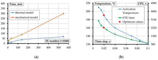 FE mesh optimization: (a) the FE number effect on the simulation duration; (b) the effect of extrusion temperature and assumed time step on the calculation cost.