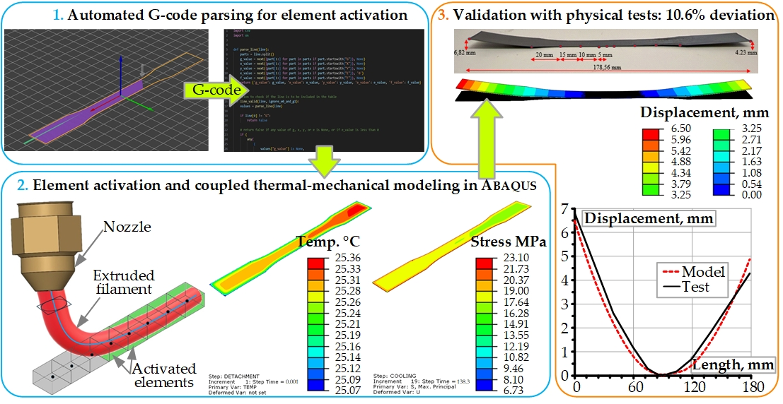 ). While similar G-code-based activation strategies have recently emerged in the literature, the explicit simulation of the detachment stage distinguishes this work. It enables a more comprehensive and experimentally validated prediction of deformation mechanisms in PLA components fabricated via FFF. The modeling framework couples a transient thermal analysis with a mechanical simulation to predict residual stresses and warpage in polylactic acid (PLA) components fabricated via FFF. Physical tests verify the model’s predictive capability, highlighting its potential for optimizing FFF parameters and improving part quality. By integrating G-code-based element activation with thermo-mechanical modeling, this study provides a comprehensive and scalable tool for controlling FFF processes.