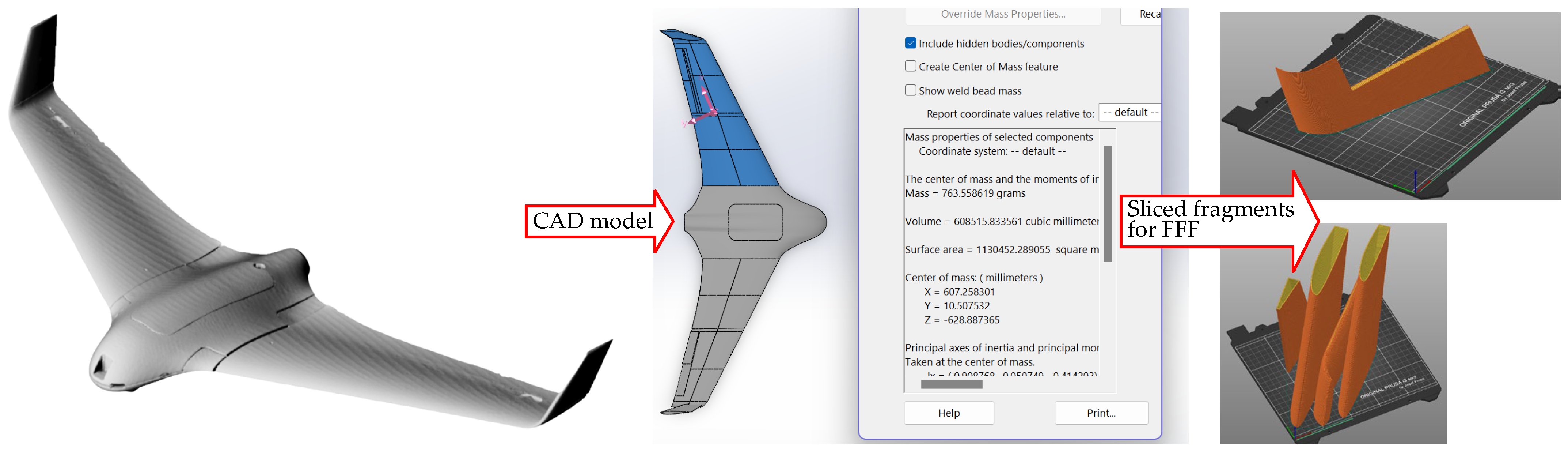 27] motivated the development of the present study. That project developed an FFF model of the drone wing for manufacturing with a desktop 3D printer. The model had to maintain the drone’s weight, which was designed from expanded polyethylene. This constraint imposed strict weight limitations. The fabrication space limitations of the