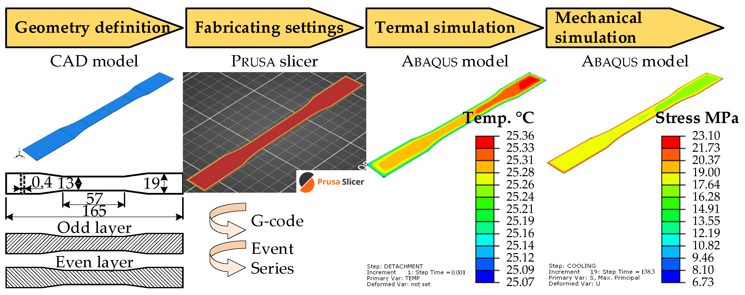 14]. A transient thermal model determines the temperature distribution throughout the printing process, providing a boundary condition for the subsequent mechanical simulation. The development of an automatic G-Code generation procedure into an Event Series, which describes the nozzle’s position as a function of time and activates the corresponding elements, significantly contributes to this study’s impact on engineering practice. Unlike earlier approaches that relied on simplified geometries and manually defined activation sequences [