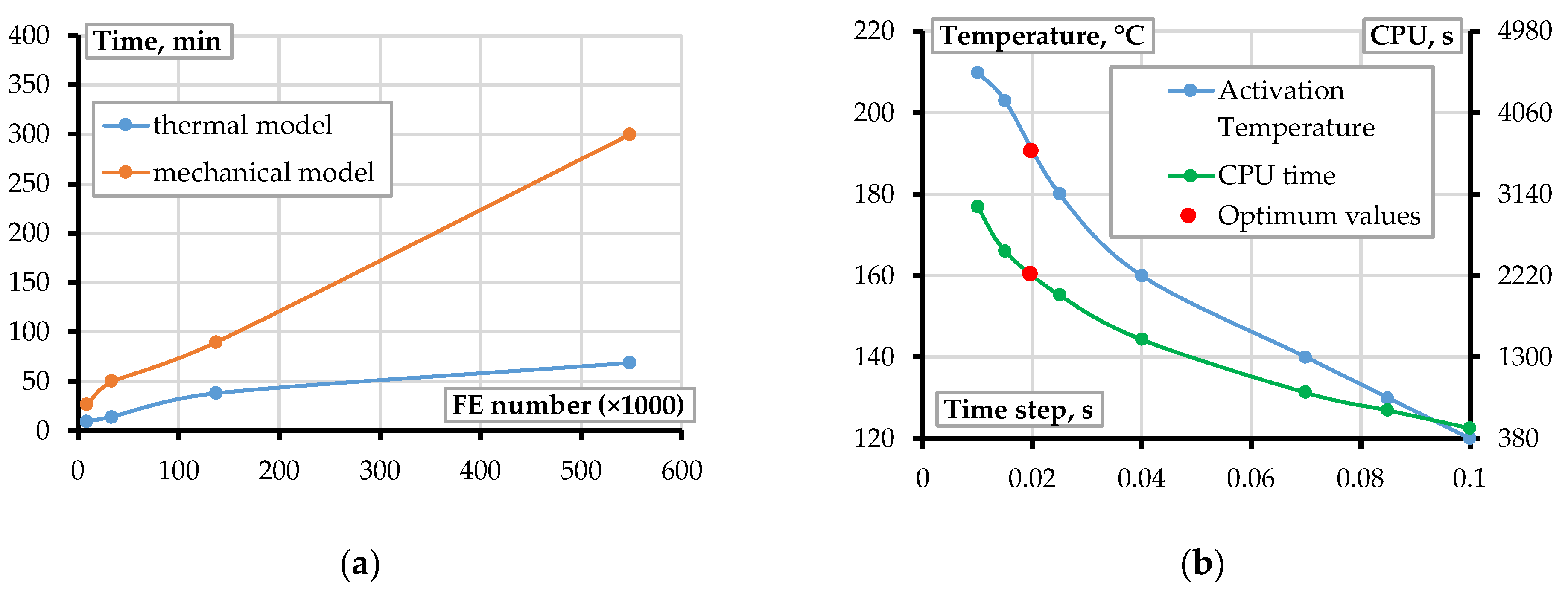 Figure 8 illustrates the influence of mesh density on the computational efficiency of the warpage simulation. The simulations were performed by varying the number of FE in the model (