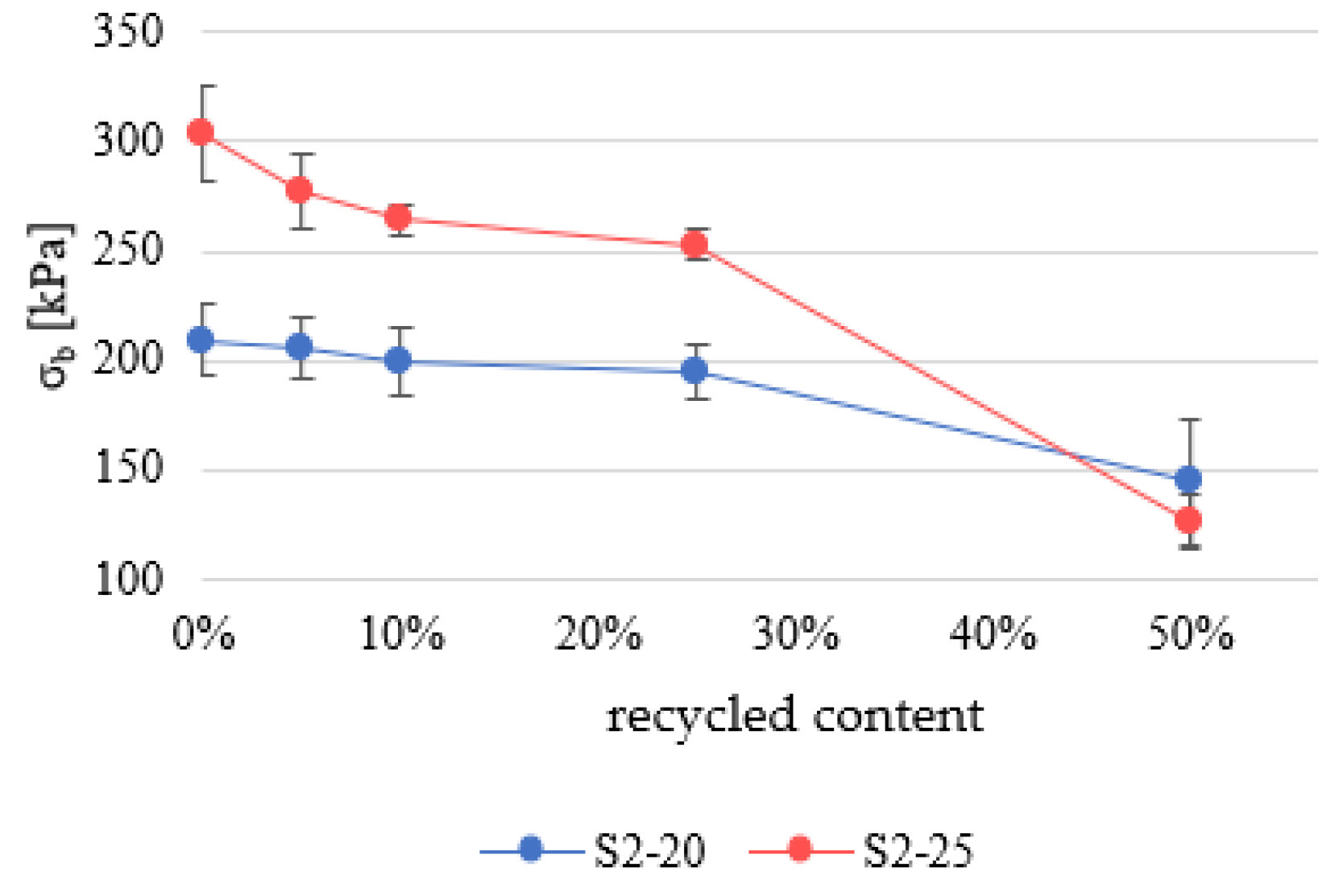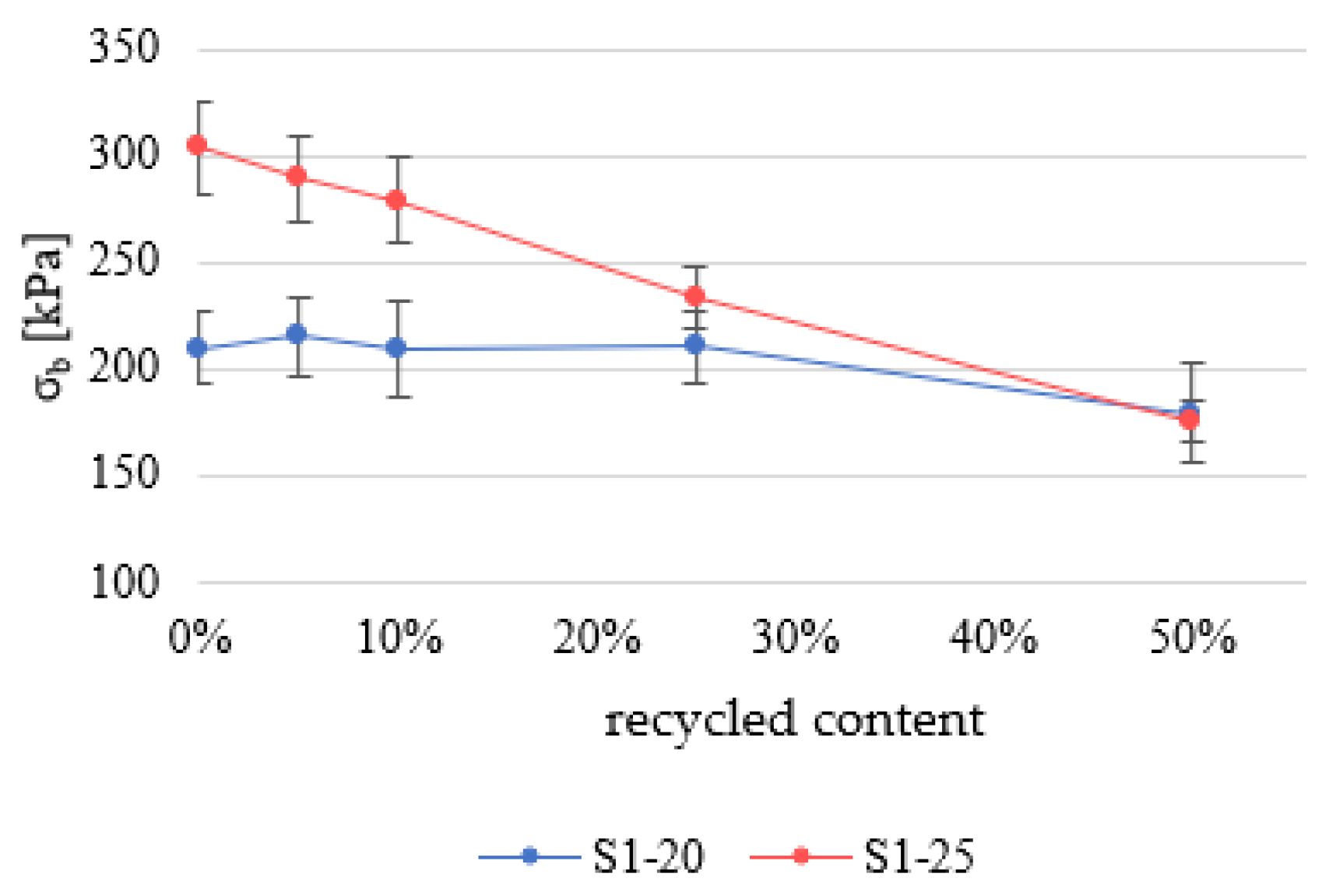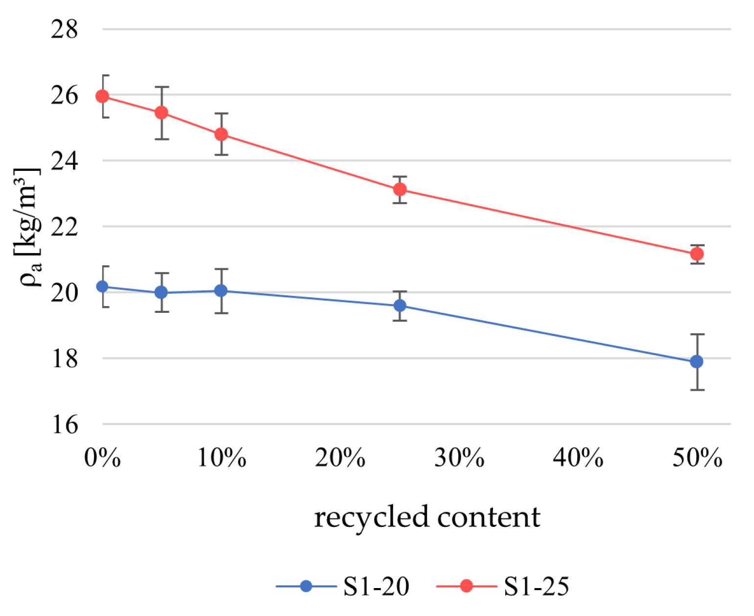 Series S1–25 and S2–25 have a more significant performance drop with increased recycled content, which is expected due to the pronounced drop in density. According to EN 13163:2016 [