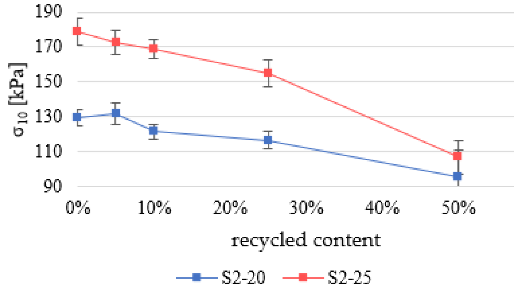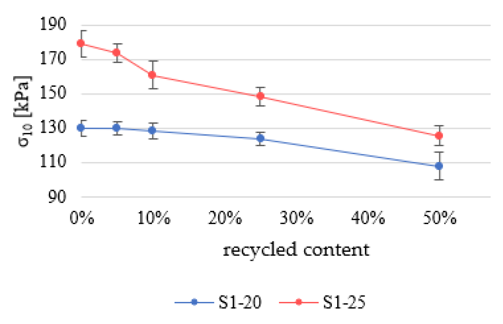 Figure 10 presents the mean values of compressive strength at 10% deformation for samples taken from the bottom, middle, and top sections of each EPS block, across all recycled content levels for both types of recycled EPS.