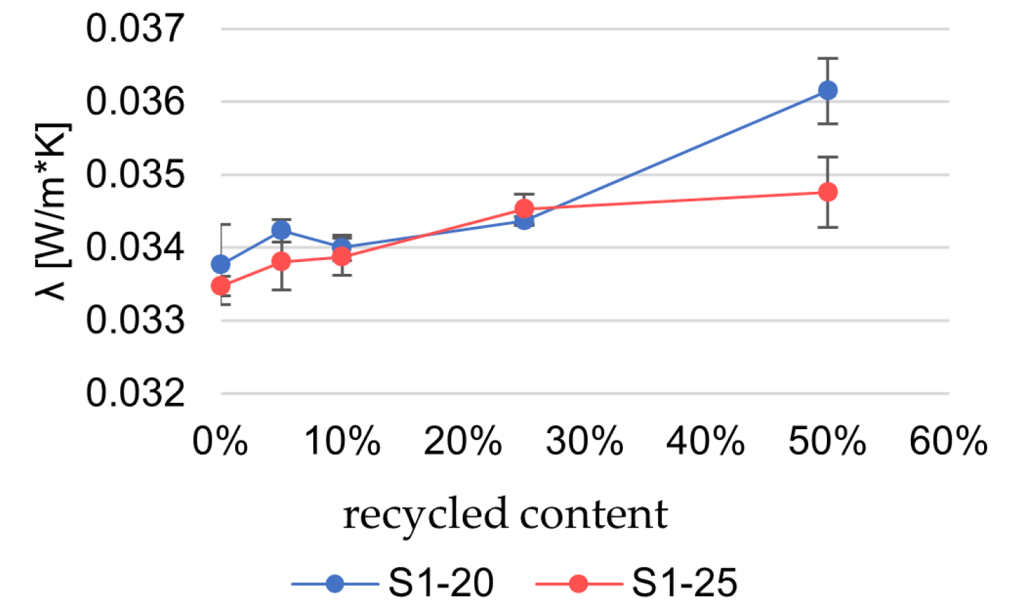 There is less than a 5% increase in thermal conductivity in samples S1–20 and S1–25 while the recycled EPS is below 25% when compared with the reference material, while the S1–25 series with 50% recycled material has an approximately 4% increase in thermal conductivity.