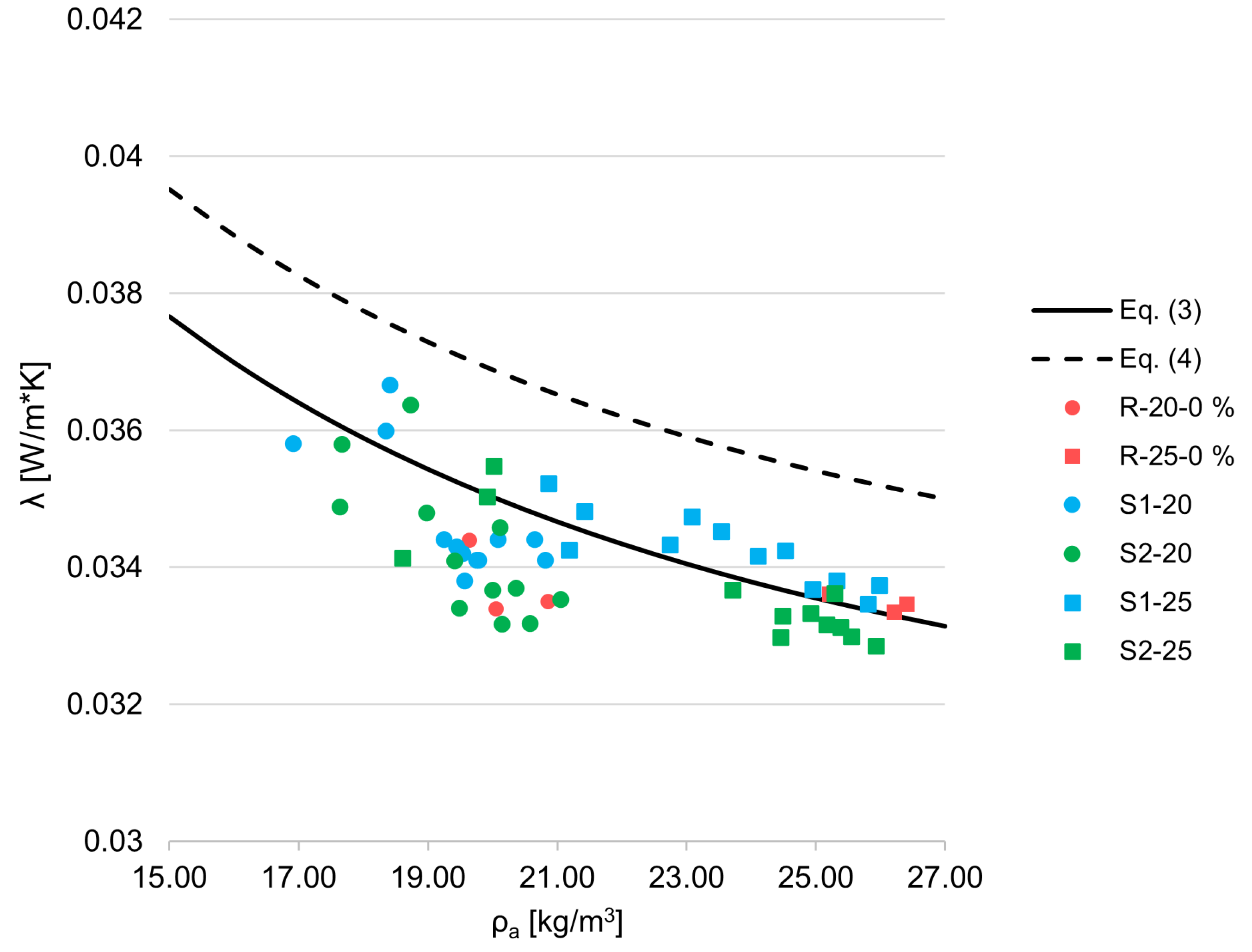 The reference samples (R-20-0% and R-25-0%) have thermal conductivity that is very close to or slightly below the curve represented by Equation (3), which represents the standard relationship between thermal conductivity and density for virgin EPS. Importantly, none of the measured results exceed the curve defined by Equation (4), which corresponds to the 95% confidence interval. This indicates that the thermal performance of these samples falls well within the expected variability for standard factory-produced EPS. Notably, the S2–20 series, which incorporates recycled EPS from packaging waste, displays thermal conductivity values comparable to those of the S1–20 series. This suggests that, at this level of recycled content, the source and prior use of the recycled material do not have a significant influence on the thermal conductivity of the final product. The dataset in this study focuses primarily on EPS materials with nominal densities in the range of 20–25 kg/m3. To fully characterize thermal conductivity behavior across the broader application spectrum, further validation is required for materials with nominal densities below 20 kg/m3 and higher than 25 kg/m3.