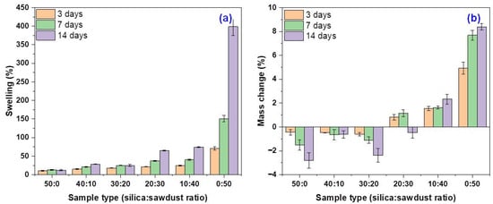 As shown in Table 3, the composites exhibited increased swelling with longer immersion times in the acid solution. Notably, even in the weakest concentration of 10% acetic acid, effective mass losses (negative values) were observed, suggesting the possible partial dissolution of both the elastomer matrix and the wood sawdust. Conversely, positive mass changes may indicate the potential binding or retention of acetic acid groups within the elastomer or filler, possibly through chemical interaction or absorption.