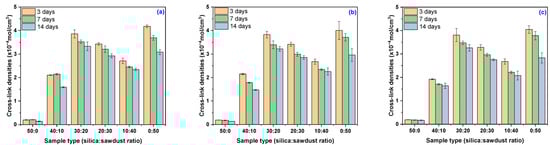 Variation of composite cross-link density as a function of immersion time and acetic acid concentration: (a) 10% acetic acid solution, (b) 20% acetic acid solution, and (c) 30% acetic acid solution.