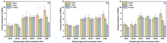 Variation of composites’ Young’s modulus, E (MPa), as a function of acetic acid concentration and immersion time: (a) 10% acetic acid in solution, (b) 20% acetic acid in solution, (c) 30% acetic acid in solution.