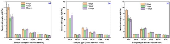 Variation of composites’ Tensile strength, σ (MPa), as a function of acetic acid concentration and immersion time: (a) 10% acetic acid in solution, (b) 20% acetic acid in solution, (c) 30% acetic acid in solution.